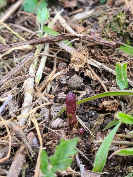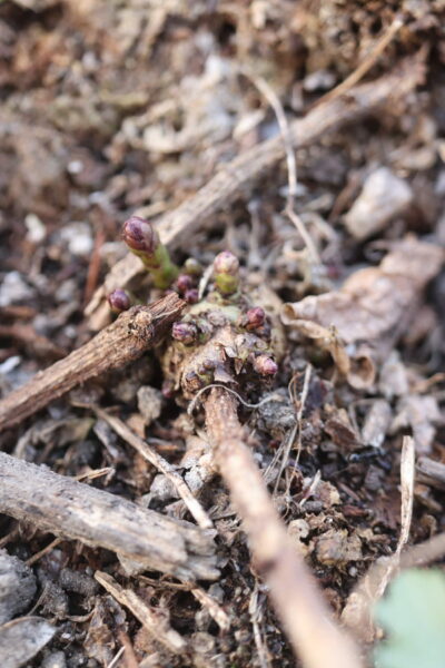 ホップの新芽。赤いですね。3月7日に発見しました。