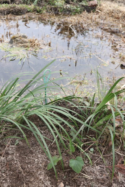 ミニビオトープは、夫担当。周辺に植物を植えたいとのことで、セキショウが植え付けられました。