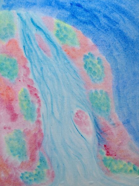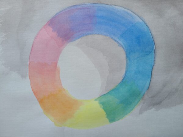シュタイナー教育に長く携わってこられた先生が、「本物の“生きた色”というのは、虹のように移ろっていく色です。ベターッと固まったように塗られた絵具の色からは、それを感じ取ることができません。だからこそ、画用紙をぬらして色を体験することが大切なのです。ぬらし絵(水彩)に取り組むことは、生きた色を感じることなのです」と語られていた言葉が、強く心に残っていました。