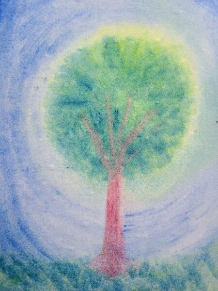 一方、夏の木は、中心から黄色が放射しています。黄色に青を混ぜると、緑になりますね。光の当たり方によって、葉の色が微妙に違って見える様子を、描くことで表現しました。