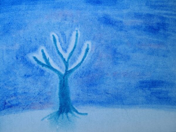冬の木。冷たく澄んだ空気を、プルシャンブルーで表しました。そこに、カーマインの赤をほんの少しだけ加えると、不思議なことに寒さがいっそう際立って感じられました。