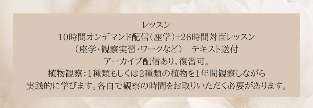 〇対面レッスン(zoomオンライン・教室):四大元素と植物観察実習、その他観察実習、ワークなどを一緒に行います。また、座学の大事な部分についても直接講師が説明します。