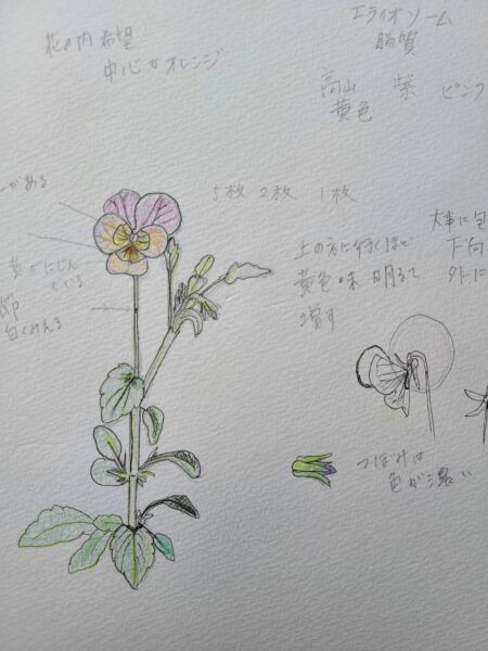そして、ヴィオラの構造をしっかりと確認します。花びらの数や形、大きさ、質感、雌蕊、雄蕊の付き方や本数。葉の形や大きさ、葉の付き方など。