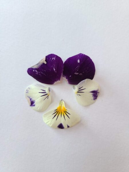 終わりかけの花を摘ませてもらいました。5枚の花弁です。濃い紫色の上弁2枚、側弁2枚、黄色が根元にある唇弁1枚。