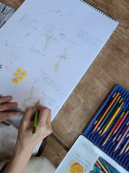 まずは、スケッチをして、見て気づいたことを記録していきます。スケッチしてみることで意識的に植物を見ることができ、たくさんの気づきがあります。